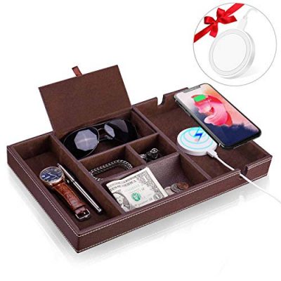 The Baoyun Mens Valet Tray with Wireless Charger is the perfect nightstand organizer for both men and women. Made with a faux leather exterior and a soft faux suede interior, this valet tray provides protection for your items without damaging them. The tray features 6 compartments, including a smartphone charging station, to help keep your nightstand, desk, or dresser top clutter-free. Its compact size is perfect for any space and the tray is easy to clean. This valet tray is not only functional, but it also makes a great gift for any occasion. With a customer rating of 4.6/5, this valet tray has received high praise for its convenience, quality, and value.
