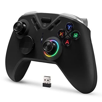 The DOYOKY Wireless Game Controller is a versatile controller that is compatible with PC, Android, Steam, and Nintendo Switch. It offers multiple connection options including 2.4G wireless, Bluetooth 4.0, and wired PC connection. The controller features a colorful RGB LED backlight on the buttons and joystick for an immersive gaming experience. It also has dual vibration motors for enhanced feedback and a built-in 6-axis gyro for accurate positioning. With four programmable M buttons, you can easily customize complex operations. The controller comes in a sleek black color and includes a phone bracket for mobile gaming. Overall, it offers great value for its price.