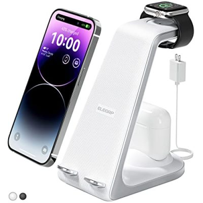 The ELEGRP Wireless Charger is a convenient 3-in-1 charging solution for your iPhone, Apple Watch, and AirPods. With a removable and replaceable charging cable, you can use the included USB-C charger for fast charging your newer Apple Watch. The wireless charger is compatible with various iPhone models, Samsung, Google, and other phones with wireless charging capabilities. Its compact design makes it a space-saving solution for your bedside table or desk. The charger also features a power LED indicator, non-slip pads, and heat dissipation holes for safe and efficient charging. With FCC certification and Qi protocol, it offers multi-protection for your devices. The package includes the wireless charging station, USB-C cable, fast adapter, and more, along with a 1-year warranty. Overall, the ELEGRP Wireless Charger is a reliable and versatile charging solution for multiple devices.