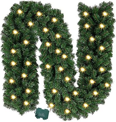 The 10Ft Pre-lit Christmas Garland with 50 LED Lights is a beautiful and festive addition to your holiday decorations. With a string light that features a built-in timer, this garland is convenient and easy to use. The garland is made from high-quality and flame-resistant PVC material, ensuring safety and durability. It is also water-resistant, making it suitable for both indoor and outdoor use. The lush garland has 240 thick branch tips, creating a full and realistic look. The battery-operated LED lights are a charming addition and can be controlled with the timer. Overall, this garland is a great choice for adding a touch of Christmas spirit to your staircase, railing, mantle, fireplace, or front porch.