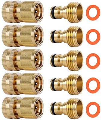 The SHOWNEW Garden Hose Quick Connectors are a value pack of 5 solid brass connectors designed to easily and tightly connect your water hose. Made from heavy-duty and rust-proof brass, these connectors are built to last. The standard GHT threads work with most garden hoses and ensure a leak-proof connection. With their precision design, these connectors can quickly attach and detach from your hose, saving you time and effort. The package includes 5 female connectors, 5 male connectors, and 5 extra washers. Customers rave about the quality and ease of use of these connectors, making them a must-have for anyone with multiple hoses. Upgrade your watering experience with these reliable and convenient quick connectors.