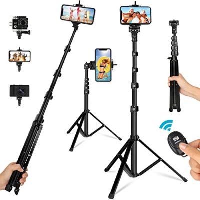 Introducing the 62″ Phone Tripod, a versatile and adjustable tripod stand that combines a selfie stick and wireless remote. This professional-grade tripod can extend to a higher level than any other tripod and is made from lightweight aluminum alloy for easy portability. With a 5-section telescoping stick, it can be extended from 17.5 inches to 62.5 inches, providing flexibility for different photography heights. The tripod features a wireless remote shutter that allows you to take selfies or group photos from up to 10 meters away. It is widely compatible with most iPhone and Android smartphones, as well as digital cameras and action cameras. With its sturdy construction and user-friendly design, this tripod is perfect for vlogging, video calls, live broadcasting, and more. Get the 62″ Phone Tripod today and take your photography and videography to new heights.