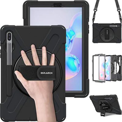The BRAECN Galaxy Tab S6 Case is a heavy-duty shockproof case designed for the Samsung Galaxy Tab S6 10.5 Inch. It provides full protection with its premium hard plastic and soft shock-absorbing silicone materials. The case features a 360-degree swivel stand, hand strap, and a portable shoulder strap, offering flexibility and convenience during work, study, or travel. It also includes a safe storage holder for the S Pen, with support for automatic adsorption and wireless charging. The precise cutout design allows easy access to all tablet features. The case comes in black color and the dimensions are 9.92Lx7.09Wx0.79H. While it offers great protection, some users have mentioned issues with the case being off-center with the camera and the durability of the kickstand. Overall, the BRAECN Galaxy Tab S6 Case is a reliable option for those seeking heavy-duty protection for their Samsung Galaxy Tab S6.