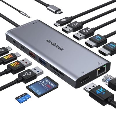 The USB C Laptop Docking Station Dual Monitor is a versatile and powerful hub that provides multiple connectivity options for your laptop or computer. With 14 different ports, including dual 4K HDMI, 4K Displayport, USB-C, USB-A, USB 2.0, gigabit Ethernet, and SD/TF card slots, this docking station meets all your connecting needs. It supports triple monitor display and fast data transfer speeds of up to 10Gbps. The docking station also features a 100W power delivery port for charging your laptop and a 3.5mm audio/mic port for wired headset connectivity. Overall, it provides a convenient and efficient solution for expanding the capabilities of your laptop.