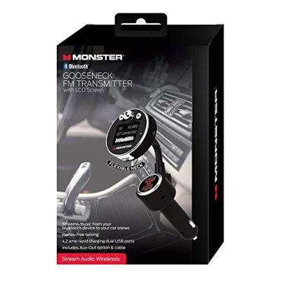 The Monster Bluetooth FM Transmitter is a versatile car kit that allows for hands-free calling and music streaming. With its dual USB-A charging ports, radio control, and MP3 player, it offers a range of convenient features. The FM transmitter is easy to connect to your car radio and wirelessly streams call audio over the stereo system. It also allows you to change radio stations, stream music from your phone or iPod, and add more bass to your music. The adjustable gooseneck and 1.77" full color LCD screen provide optimized viewing and easy navigation. With two 2.4-amp USB-A ports, you can rapidly charge your mobile devices on the go. Overall, this Bluetooth FM transmitter offers a complete hands-free solution for your car.