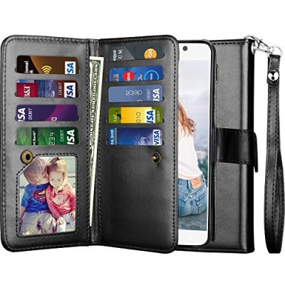The NJJEX for Galaxy Note 5 Case is a versatile and convenient accessory for your Samsung Note 5. With a durable PU leather design, this wallet case offers 9 card slots, a cash compartment, and a detachable phone case. The built-in kickstand function allows for hands-free viewing, and it also comes with a wrist strap for added convenience. The magnetic absorption back cover ensures that your phone and wallet stay secure. This black wallet case is designed to protect your Galaxy Note 5 from scratches, dust, and daily wear. Overall, it is a practical and stylish solution for keeping your essentials organized while on the go.