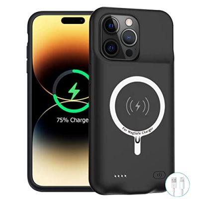 The Battery Case for iPhone 14 Pro is a portable protective slim case that offers advanced features and maximum protection for your iPhone. With a rechargeable 7000mAh battery, it provides over 150% extra power, equivalent to 8+ hours of talk time or 12+ hours of web-browsing time. The case is designed with a hard-shell and raised sides to protect your phone from scratches, drops, and impacts. It also features a convenient sync-through technology, allowing you to charge your battery case and iPhone simultaneously while syncing your phone with your MacBook, PC, or laptop without removing the case. The battery case is compatible with wireless charging and supports Carplay. It comes with a charging cable and offers a 100% satisfaction guarantee with a 30-day money-back guarantee and 1-year replacement warranty.