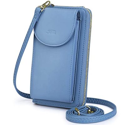 The S-ZONE Small Crossbody Bags Cell Phone Purse is the perfect accessory for women on the go. Made of soft and durable PU leather, this wallet offers RFID blocking function to protect your valuable private information. The front phone pocket can fit up to a 6.5-inch phone, making it compatible with various iPhone and Samsung models. The strong magnetic snap closure keeps your phone safe while allowing for easy opening. With multiple pockets and card slots, this purse provides ample storage space for cash, cards, and other small items. It also comes with a one-year warranty and satisfaction guarantee. Available in blue, this small crossbody bag is stylish, functional, and secure.