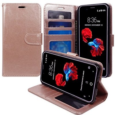 Protect your ZTE Quest 5 with style using the Asuwish Wallet Case. This case is compatible with various ZTE models and comes in a beautiful Rose Gold color. It features a card holder with three slots, allowing you to securely store your cards and cash without carrying a separate wallet. The case also includes a kickstand, which can be adjusted to provide a comfortable viewing angle for reading, watching videos, or video calling. The package includes a tempered glass screen protector and a detachable wrist strap as free gifts. Asuwish offers excellent customer service and a warranty for defective products.