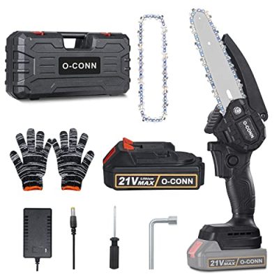 The O-CONN Cordless Mini Chainsaw is a perfect handheld portable electric chainsaw for tree trimming and branch wood cutting. With a high-efficiency cutting capability, it uses a powerful motor and a high-power battery for faster and more efficient cutting. It also features multiple security protections, easy operation, and an ergonomic design for comfortable and long-lasting use. The package includes all the necessary accessories, making it a complete mini chainsaw kit. Overall, it is a great tool for gardeners, DIYers, and anyone in need of a compact and powerful chainsaw.