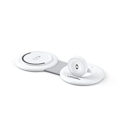 The UCOMX Nano Mini Magnetic 2 in 1 Wireless Charger is the ultimate charging station for your iPhone, iWatch, and AirPods. With its compact and foldable design, it is perfect for use at home, on-the-go, or while traveling. The charger features a built-in FOD program for security testing, ensuring that your devices are charged safely. It also includes a mobile phone holder, a convex-shaped charging board for securely holding large iPhone models, and an indicator light to show the charging status. Compatible with Apple devices that support magnetic suction, this charger is a convenient and stylish solution for all your charging needs. The UCOMX Nano Mini Magnetic 2 in 1 Wireless Charger is a fantastic gift idea and comes with a complimentary adapter and USB-C charging cable.