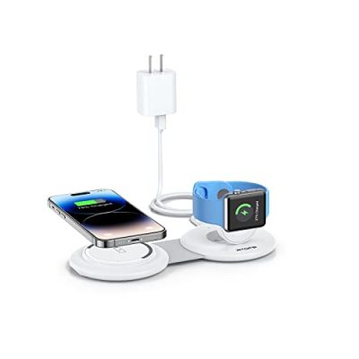 The Charging Station for Apple Multiple Devices is a 3 in 1 foldable magnetic wireless charger dock that provides convenient charging for your iPhone 14, Apple Watch, and AirPods. With a compact and lightweight design, it is perfect for travel, home, and office use. The charger features a magnetic suction for accurate and automatic charging of compatible Apple devices. It is equipped with intelligent protection technology for safe and fast charging. The package includes a wireless charger, 18W adapter, one charging cable, and user manual. Overall, this charging station offers a convenient and efficient solution for charging multiple Apple devices simultaneously.