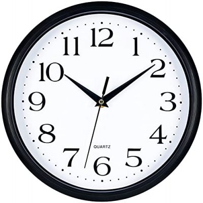 The Bernhard Products Black Wall Clock is a classic 10-inch round clock with a sleek black design. It features large black bold numbers against a white face, making it easy to read from a distance. The clock operates with a silent non-ticking mechanism, ensuring a quiet environment. The precise quartz movements guarantee accurate timekeeping. With its sturdy plastic frame and glass lens, it is easy to clean and keeps dust away. This versatile clock is perfect for any room in your home, including offices, classrooms, kitchens, bedrooms, and bathrooms. It is easy to hang on the wall and requires 1 AA battery (not included). Enjoy a 1-year manufacturer warranty with your purchase.