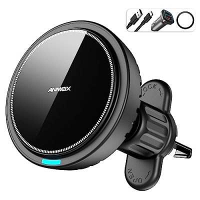 The ANMEIX for Magsafe Charger is a powerful wireless charger and magnetic phone holder designed for cars. It features excellent cooling technology, ensuring your phone charges without overheating. With 15W full-speed charging capability and smart thermal management, it charges your iPhone 14 Pro Max or 12/13/14 series with up to 15W magnetic power. The charger also boasts a strong magnetic lock with 2 layers of magnets for secure attachment, even during high-speed turns or bumps. Its easy installation and 360° rotation allow for convenient use in both portrait and landscape orientations. The package includes the Magsafe wireless car charger, dual port car charger, USB-C to USB-A cable, and various accessories. With its thoughtful features and accessories, the ANMEIX Magsafe Charger provides a reliable and versatile charging solution for your car.