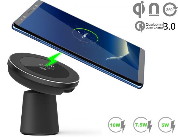 The Wireless Car Charger Mount from VANMASS is an easy-to-use wireless charger. It also serves as a flexible phone mount that you can use while driving. It provides wireless charging for up to 10W power output for Qi-compatible phones. The mount has an electric automatic clamp and an adjustable bottom tray. These allow the mount to hold most phone sizes. It also supports 360-degree phone rotation.