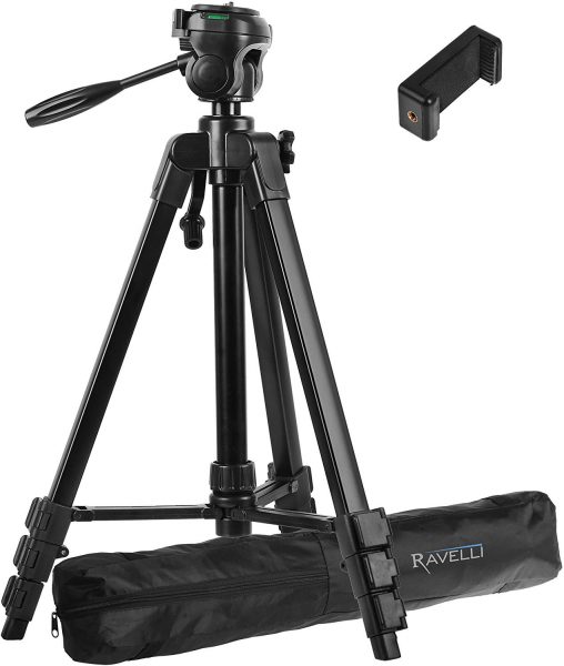 Ravelli is one of the few crossover tripods that includes a cell phone mount. This sturdy tripod is made from durable aluminum and has a pan and tilt feature that can make your smartphone a stabilizer. The legs are extendable up to 61″ which is great for experimenting with angles. It even comes with a carrying case so you can lug it around everywhere.