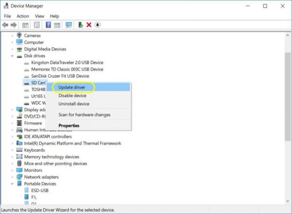 - Right-click on your SD card, and select Update driver.