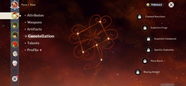 Klee has a total of six constellations. Her constellation is the Trifolium that can be activated when you get Klee’s Stella Fortuna from wishing. Unfortunately, you can’t use another character’s Stella Fortuna to level up Klee since each constellation is unique to its owner.