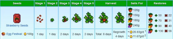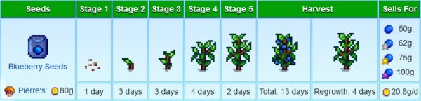 Similar to strawberries, blueberries have a lot going for them. Aside from growing from seed to maturity in just 13 days, there’s also a small chance you’ll get more than three blueberries per harvest. It also regrows its fruits in just four days. Each normal quality blueberry sells for a solid 50g, a good deal since each plant assures at least three per seed. You can get some blueberry seeds from Pierre’s for just 80g. If you have a preserves jar or a keg, you can turn blueberries into artisan products and sell them for more.