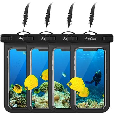 The ProCase 4 Pack Waterproof Phone Pouch is a universal size waterproof case dry bag designed with a clear window on both front and back sides, perfect for taking pictures, videos, and checking emails. It is IPX8 certified waterproof and compatible with devices up to 3.35 x 6.69 inches, offering full touch screen functionality. The product provides protection for your device while maintaining functionality, and comes with a neck strap for convenient carrying. It is suitable for various activities such as swimming, boating, kayaking, and snorkeling. Most users find it effective in protecting their phones, but some have reported concerns about its sealing capabilities underwater.