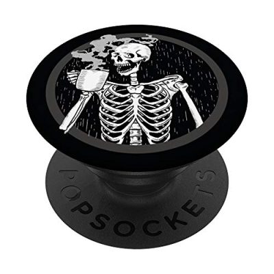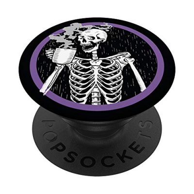 The Skeleton Drinking Coffee or Death Black with purple Ring PopSockets PopGrip offers a unique and stylish way to grip your phone or tablet while showcasing your love for coffee and music. Its metal skull design and swappable PopTop provide versatility and customization options. The expandable stand allows for hands-free use, making it perfect for watching videos or taking group photos. While the advanced adhesive ensures easy removal and repositioning, it may not stick well to certain cases. Overall, this PopGrip makes for a great gift and accessory for anyone who enjoys a good cup of coffee and wants to add a touch of skull-inspired flair to their device.