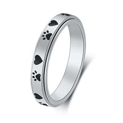 The LuckyAmor Spinner Ring is a unique and stylish ring designed specifically for women and girls. It features a spinner design that can help relieve stress, anxiety, and insomnia. Made of high-quality stainless steel with a mirror-shiny finish, this ring is solid, sturdy, and durable. It is also hypoallergenic and will not turn your finger green. The outer ring of the spinner is adorned with colored dog paw prints, adding a touch of cuteness and charm. This ring comes with a velvet bag, making it a perfect gift for your loved ones. Available in size 6-10, the LuckyAmor Spinner Ring deserves a score of 8 out of 10.