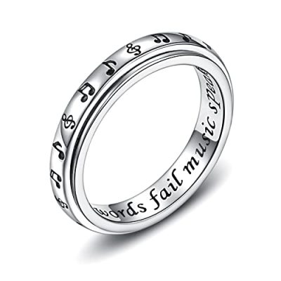 The 925 Sterling Silver Spinner Fidget Ring is a beautiful and meaningful piece of jewelry designed to relieve anxiety and stress. The ring features a musical symbol spinner that rotates when needed to calm nerves and promote relaxation. Made of high-quality 925 Sterling Silver, this ring is hypoallergenic and safe to wear for extended periods. It comes in a sturdy gift box with a polishing cloth, making it a perfect gift for women or men on various occasions. The ring is adorned with the inscription 'Where words fail, music speaks,' adding to its sentimental value. With positive customer reviews and a 4.6/5 rating, this spinner ring is a stylish and practical accessory to carry in daily life.