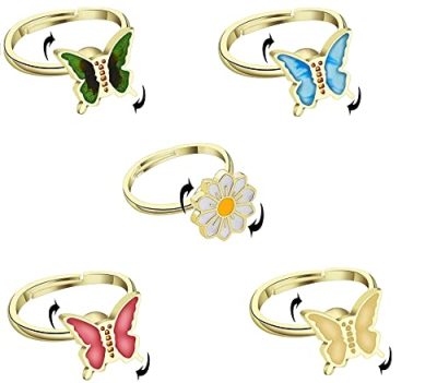 Featuring the 5Pcs Fidget Spinner Rings Butterfly Daisy Flower, this rotating spinning anxiety ring is perfect for women and girls seeking stress relief. The ring's vibrant design not only brings a good mood but also prevents finger-picking and nail-biting habits. Crafted with 48k real gold plating, it offers durability and a long-lasting luster. The open design allows for flexible adjustment, fitting ring sizes 6-9. Whether used as a fidget ring, stacking ring, or everyday band ring, it adds a fashionable touch to any outfit. These rings also make wonderful gifts for various occasions such as Christmas, birthdays, anniversaries, and engagements.