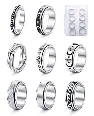 The SAILIMUE Stainless Steel Fidget Band Rings are designed to help relieve anxiety and stress. This set includes 8 different style fidget rings, offering a variety of choices for daily wear. Made of high-quality stainless steel with advanced electroplating treatment, these rings are durable and long-lasting. They feature an inner chain inlaid that can be rotated, helping to regulate mood and provide a sense of calm and focus. The rings are available in various sizes and can be worn by both men and women. With their cool design and comfortable fit, they can also be used as wedding rings or given as a thoughtful gift. Overall, these rings offer style, functionality, and stress relief in one package.